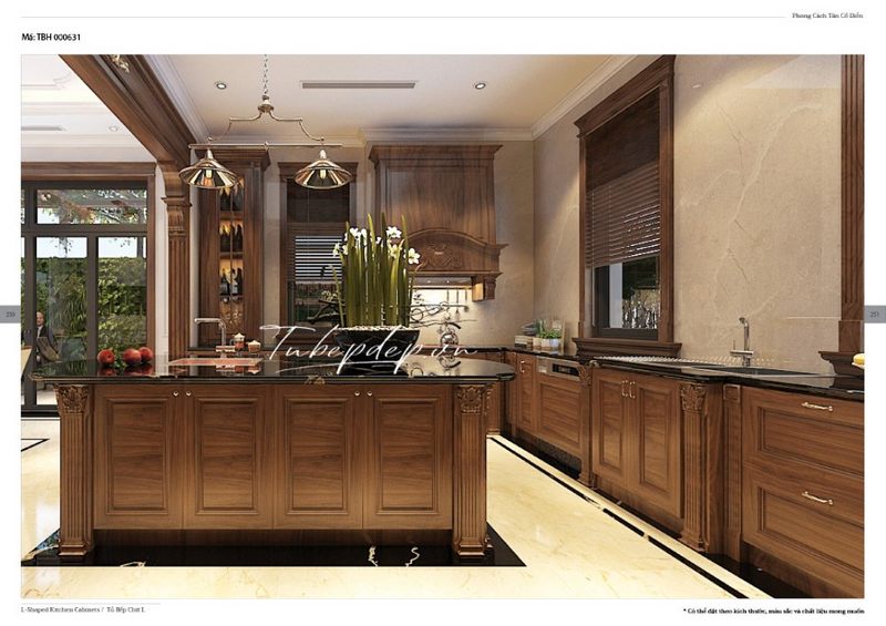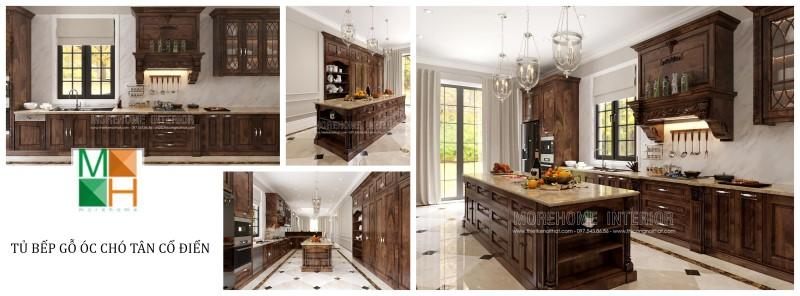 Nội thất phòng bếp tân cổ điển từ gỗ óc chó có những chi tiết trạm trỗ tinh tế, mang lại sự sang trọng, cao cấp cho ngôi nhà.